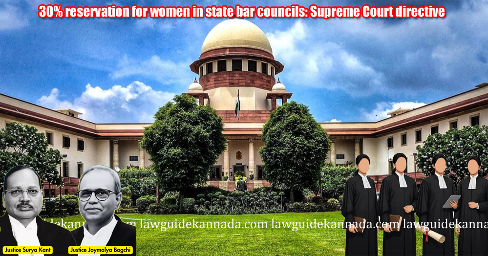 ಸುಪ್ರೀಂ ಕೋರ್ಟ್ ಮುಖ್ಯ ನ್ಯಾಯಮೂರ್ತಿ (ಸಿಜೆಐ) ಸೂರ್ಯಕಾಂತ್ ಮತ್ತು ನ್ಯಾಯಮೂರ್ತಿ ಜಾಯ್ಮಾಲ್ಯ ಬಾಗ್ಚಿ ಅವರಿದ್ದ ನ್ಯಾಯಪೀಠವು ಈ ನಿರ್ದೇಶನ ನೀಡಿದ್ದು, ದೇಶದ ಪ್ರತಿಯೊಂದು ರಾಜ್ಯ ವಕೀಲರ ಪರಿಷತ್ನಲ್ಲಿ ಮಹಿಳೆಯರಿಗೆ ಶೇ 30ರಷ್ಟು ಮೀಸಲಾತಿ ದೊರೆಯಬೇಕು ಎಂದು ಗುರುವಾರ ತಿಳಿಸಿರುವ ಸುಪ್ರೀಂ ಕೋರ್ಟ್ ಈ ನಿಟ್ಟಿನಲ್ಲಿ ಭಾರತೀಯ ವಕೀಲರ ಪರಿಷತ್ ಅಸ್ತಿತ್ವದಲ್ಲಿರುವ ನಿಯಮಗಳನ್ನು ಈ ಉದ್ದೇಶದಿಂದ ವ್ಯಾಖ್ಯಾನಿಸಿ ತಿದ್ದುಪಡಿ ಮಾಡಿರುವುದಾಗಿ ಅರ್ಥೈಸಿ ಜಾರಿಗೆ ತರಬೇಕು ಎಂದು ಸೂಚಿಸಿದೆ