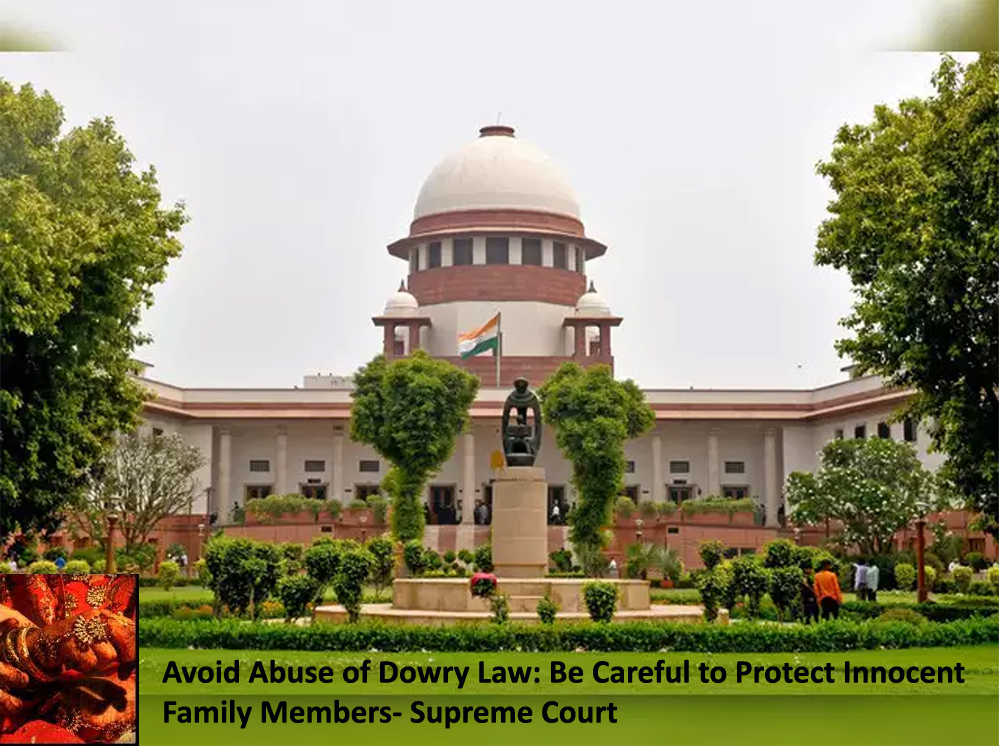 ವರದಕ್ಷಿಣೆ ಕಾನೂನು ದುರ್ಬಳಕೆ ತಪ್ಪಿಸಿ: ಅಮಾಯಕ ಕುಟುಂಬ ಸದಸ್ಯರ ರಕ್ಷಣೆಗೆ ಎಚ್ಚರ ವಹಿಸಿ – ಸುಪ್ರೀಂ ಕೋರ್ಟ್