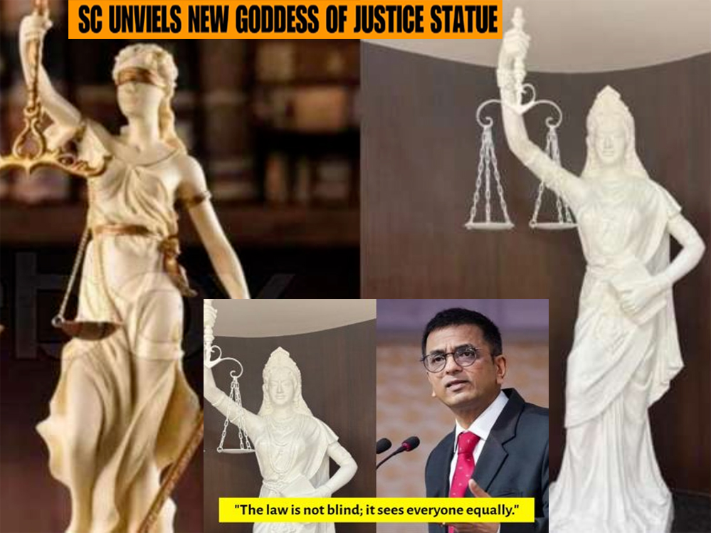 ಸುಪ್ರೀಂ ಕೋರ್ಟ್ ಮುಖ್ಯ ನ್ಯಾಯಮೂರ್ತಿ ಡಿ. ವೈ. ಚಂದ್ರಚೂಡ್ ಅವರ ನೇತೃತ್ವದಲ್ಲಿ ನ್ಯಾಯದೇವತೆಯ ಪ್ರತಿಮೆ ನೂತನವಾಗಿ ರೂಪುಗೊಂಡಿದೆ. ಈ ಮೂಲಕ ಕಣ್ಣಿಂದ ಬಟ್ಟೆ ತೆಗೆದ ನ್ಯಾಯದೇವತೆ ಹೊಸ ರೂಪದಲ್ಲಿ ಕಂಗೊಳಿಸುತ್ತಿದೆ.