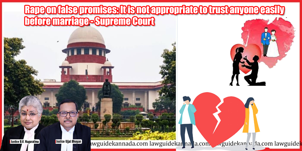 ಮದುವೆಯ ಸುಳ್ಳು ಭರವಸೆಯನ್ನು ನೀಡಿ ಅತ್ಯಾಚಾರ ಎಸಗಿದ ಆರೋಪ ಹೊತ್ತಿರುವ ವ್ಯಕ್ತಿಯೊಬ್ಬರ ಜಾಮೀನು ಅರ್ಜಿಯ ವಿಚಾರಣೆ ನಡೆಸಿದ ಸುಪ್ರೀಂಕೋರ್ಟ್ ನ್ಯಾ. ಬಿವಿ ನಾಗರತ್ನ ಮತ್ತು ಉಜ್ಜಲ್ ಭುಯಾನ್ ಅವರನ್ನೊಳಗೊಂಡ ಪೀಠವು, ಮದುವೆಗೆ ಮುನ್ನ ಹುಡುಗ ಮತ್ತು ಹುಡುಗಿ ಅಪರಿಚಿತರಂತೆ ಇದ್ದರೆ ಸೂಕ್ತ, ಯಾರು ಯಾರನ್ನೂ ಮದುವೆಗೆ ಮುನ್ನ ಸಂಪೂರ್ಣವಾಗಿ ನಂಬುವುದು ಸೂಕ್ತವಲ್ಲ. ಮದುವೆಗೂ ಮುನ್ನ ಸುಲಭವಾಗಿ ಯಾರನ್ನೂ ನಂಬಬೇಡಿ ಎಂದು ಸಲಹೆಯನ್ನು ನೀಡಿದೆ.